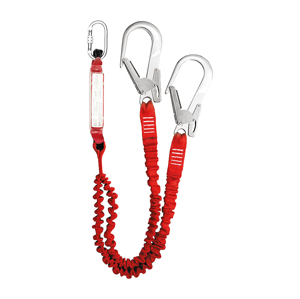 wyposażone w przednią i tylną klamrę zaczepową oraz pas do pracy w podparciu z bocznymi klamrami zaczepowymi.Amoryzator bezpieczeństwa ABM z podwójną elastyczną linką bezpieczeństwa 2LE 101