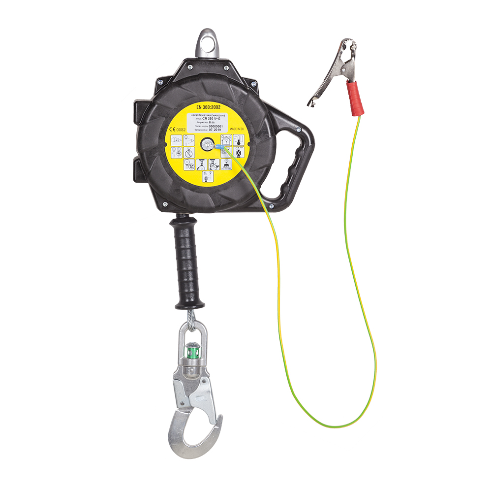 Urządzenie samohamowne CR 250V+G do pracy w pionie z rozwijaną liną zabezpieczającą oraz krętlikiem wmontowanym w obudowę wykonaną z tworzywa sztucznego przewodzącego prąd z przewodem uziemiającym. Brak konieczności stosowania amortyzatora bezpieczeństwa.