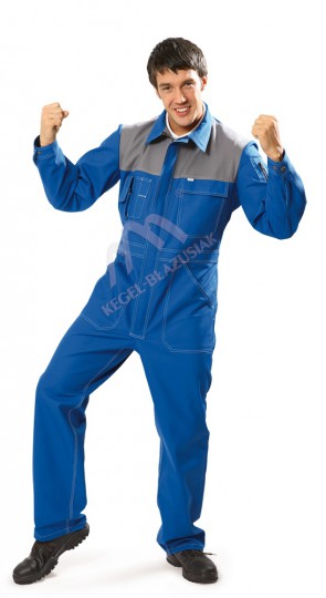 - Dwukolorowy kombinezon roboczy o kroju dżinsowym,