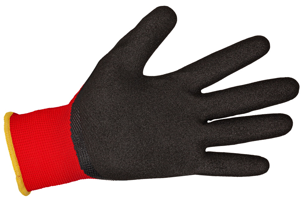 Bezszwowe rękavice z tkaniny poliesterowej z dłoniami i palcami maczanymi w nitrylu a z wykończeniem piaskowanym, mankiet elastyczny.