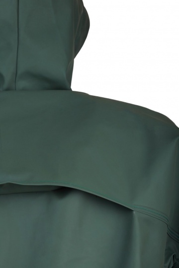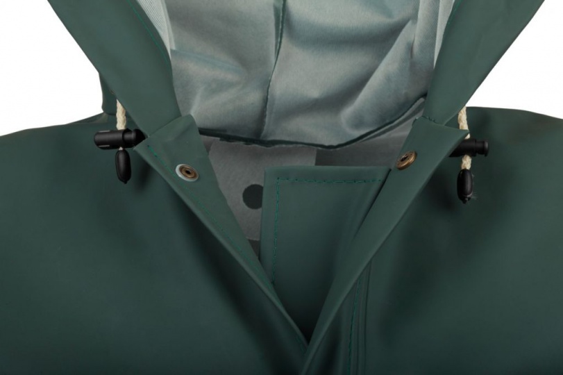 - Kurtka z kapturem i dwiema bocznymi kieszeniami przykrytymi patkami, zapinana na napy przykryte plisą.