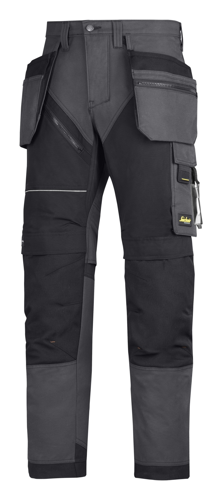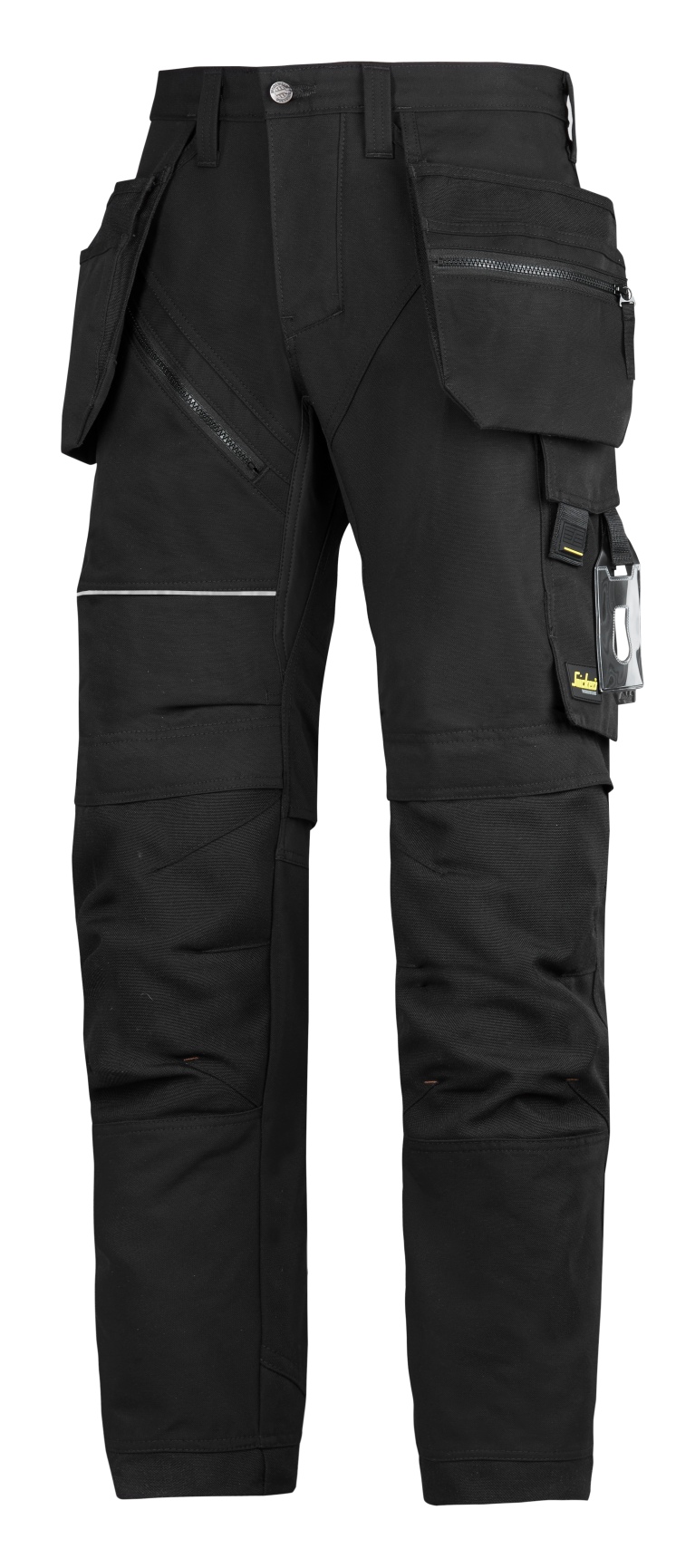 - Łatwodostępne worki kieszeniowe, w tym z częścią zamykaną na suwak, ukośne kieszenie przednie i kieszenie na nogawkach m.in. z miejscem na telefon i odpinanym identyfikatorem.